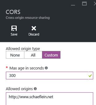 Azure Search has a REST API that allows us to perform searches. Since my blog is hosted, I have to use AJAX in the browser to execute searches. Running script from my blog domain that calls out to Azure will have cross-origin issues. Fortunately, Azure provides for this. The Index settings in Azure have a "CORS Options" property, in which a list of allowed domains can be provided.