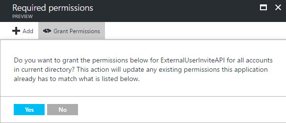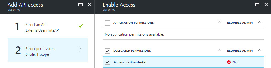 All requests to Microsoft Graph must be authorized. (The documentation discusses the authorization in depth.) In addition, the registered application must request permissions relevant to the operations they perform. The Create Invitation method requires Directory.ReadWrite.All or User.ReadWrite.All, both of which will require administrator consent. In addition, we must decide if the application will use Delegated permissions or Application permissions. Since the capability we are providing requires administrative privilege, and not every user has administrative privilege, application permissions are configured.