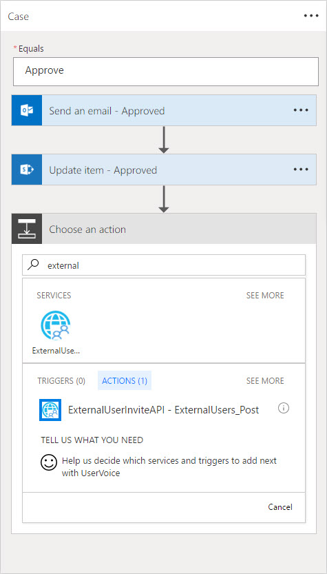 Our process requires an action that is not provided in Flow - creating an entry in Azure Active Directory for the external user. The account can be added manually in the Azure portal, but this approach will certainly not scale. This action can be automated using the Azure AD B2B service. AAD B2B is exposed thru the Microsoft Graph as the Invitation Manager. (Invitation Manager is currently in beta.)