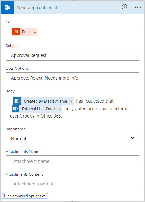 The same list of columns and properties are shown when editing the "Send approval email" action. This is equivalent to the variables capability in SharePoint Designer workflows, but the user experience is much better. The available properties are grouped by connection, and the connection has an icon that matches the action icon. Notice the email address in the "To" field has the Office 365 icon while the Created By DisplayName has the SharePoint icon. It is immediately clear the source of each property.