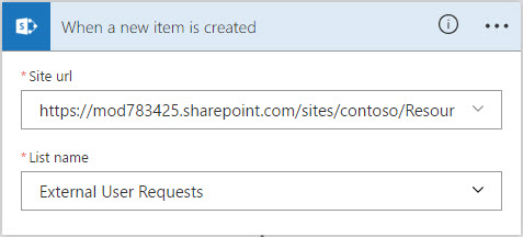 The trigger of the Flow is the creation of an item in the SharePoint list. This is a built-in trigger which requires the entry of a Site Url and selection of the list in the site. (Although not shown in the picture, the designer will query the site and show the existing lists.)