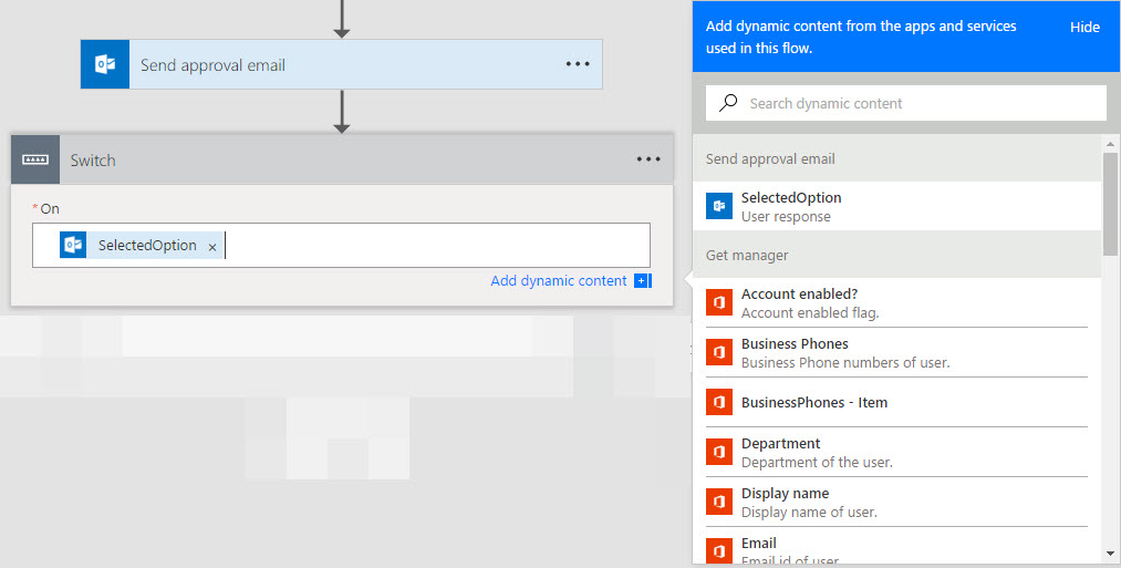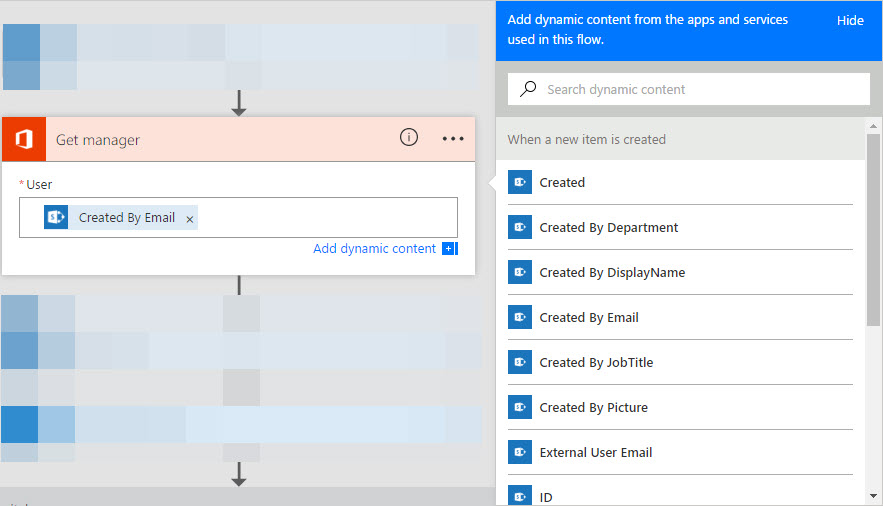 The first action will query Active Directory (AD) for the manager of the requester. "Get manager " is a built-in action that retrieves the correct property from AD. The action requires the email address of the user account to retrieve. The columns from the list item that triggers the flow are available as "dynamic content" in the designer. (Notice that the most used properties of User columns are included: Display Name, Picture, Email.)
