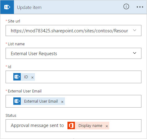 Although not strictly necessary, the Flow updates the status column of the list with the approver's name. (It seems that every business process has someone looking over it.) The "Update item" action will accomplish this. One peculiarity -- since the Title field of the list is required, we must provide a value in the action. (In our scenario, the Title field has been renamed External User Email.) Just as in the Flow trigger, we must type the Site url, then select the list. Simply selecting the dynamic content for the Id and External Email columns will suffice, along with the custom value for the status.