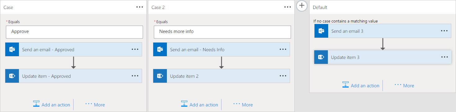 The "Switch case" action will route the Flow depending upon the value of the SelectedOption variable. There are three possible routes, matching the options displayed in the email. In all cases, an email is sent to the requester informing them of the approver's decision, and the status column of the list item is updated. In Part 5 of this series, we will discuss the creation of the External User account when the request is approved.