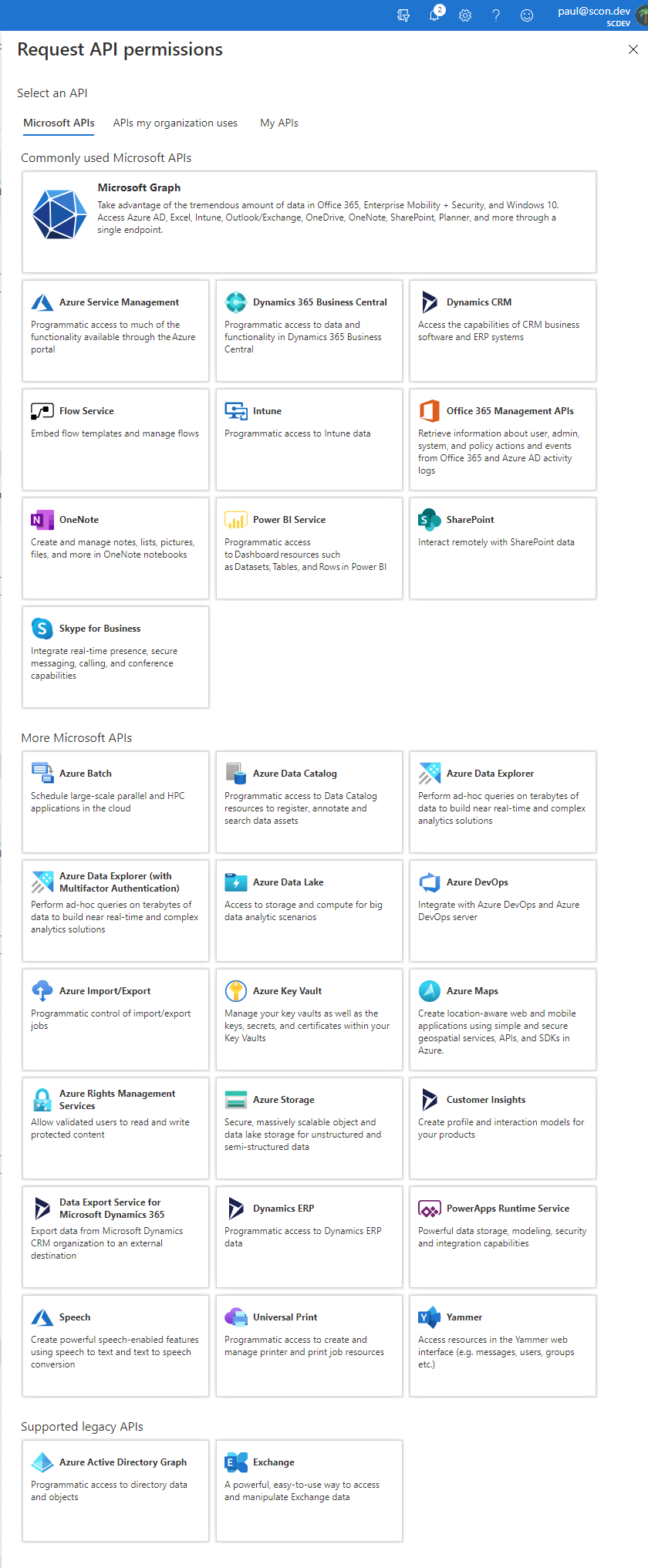 Programming against the Microsoft Identity Platform and Microsoft Graph allows developers to bridge these gaps quite naturally. In the Identity Platform, I can register an application and request permissions from Microsoft Graph as well as from a long list of Microsoft APIs that includes Office 365, Azure and the PowerPlatform. I can call the Identity Platform requesting the appropriate scopes and I get a token. A common example is an application requesting a token for https://graph.microsoft.com/User.Read and https://[Tenant].sharepoint.com/MyFiles.Read. In the application, it is just a variable containing scopes - the code remains unchanged.