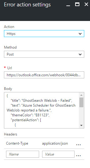 I'm using the Error action to post an Actionable Message to an Office 365 Group using the Incoming Webhook Connector. I'll write up more about that in a future post.